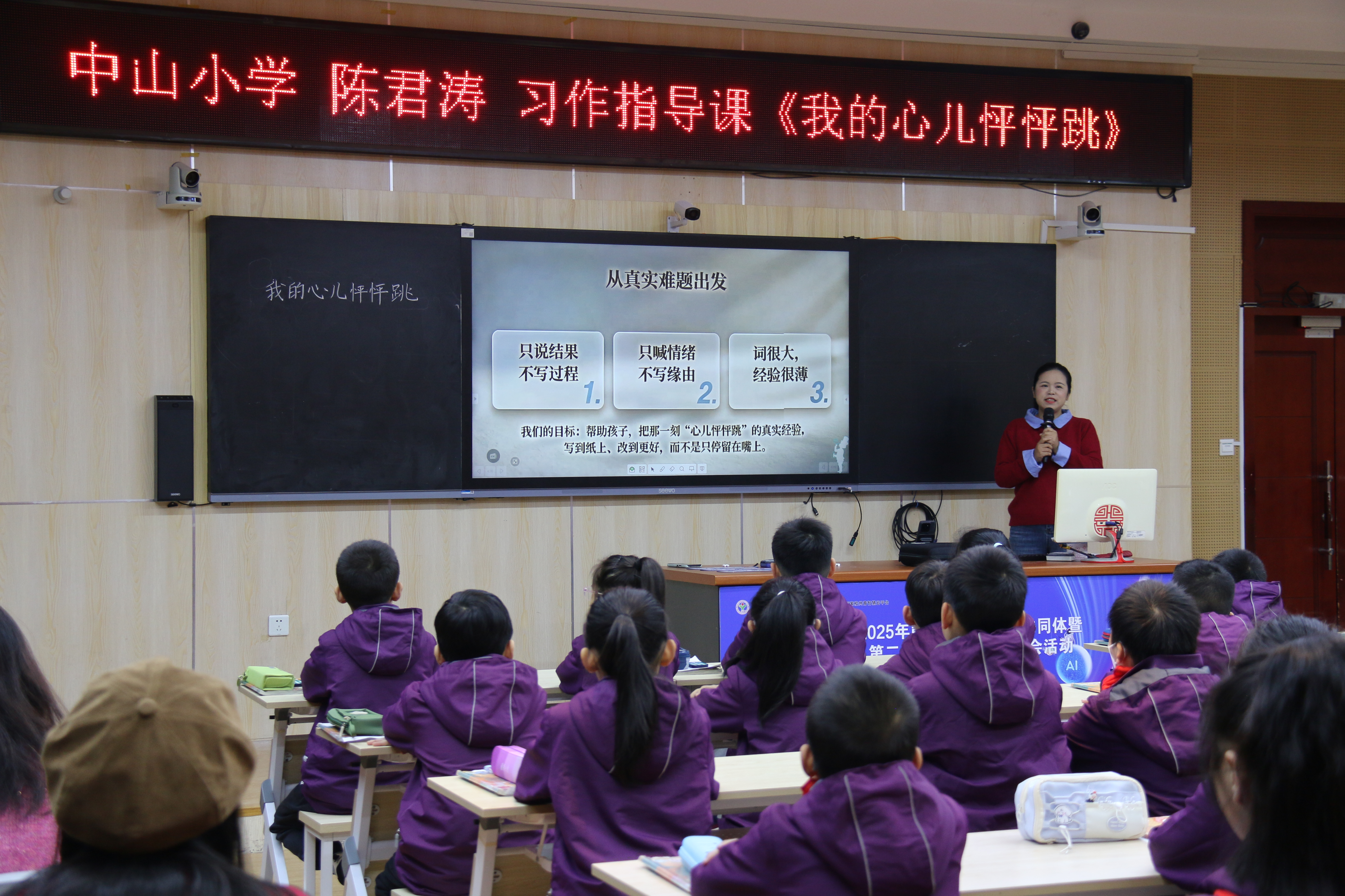 语文分会场聚焦“AI 赋能习作教学”,旨在破解学生“真情难表”的写作痛点。课前,语文教研组长谢娟阐述了两节课的备课思路:课程立足真实学情,将抽象的“心跳瞬间”转化为可感、可评的具体教学对象,构建起“生成—诊断—改进”的闭环。