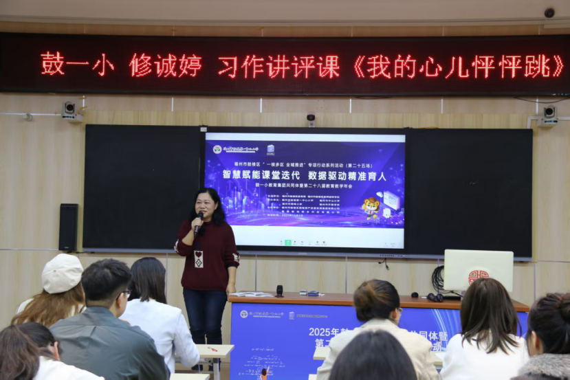 随后的习作讲评课上,鼓一小修诚婷老师则聚焦“优化与提升”。她引入“鼓教通”ai作文批阅系统,通过大数据精准把脉学生写作中的共性问题。课堂展现了“人机协作”的新范式:学生不再是被动的接受者,而是在理性采纳 AI 建议与小组互评的思辨中,从“被动修改”走向“自主表达”,真正成为了笔下文字的主人。