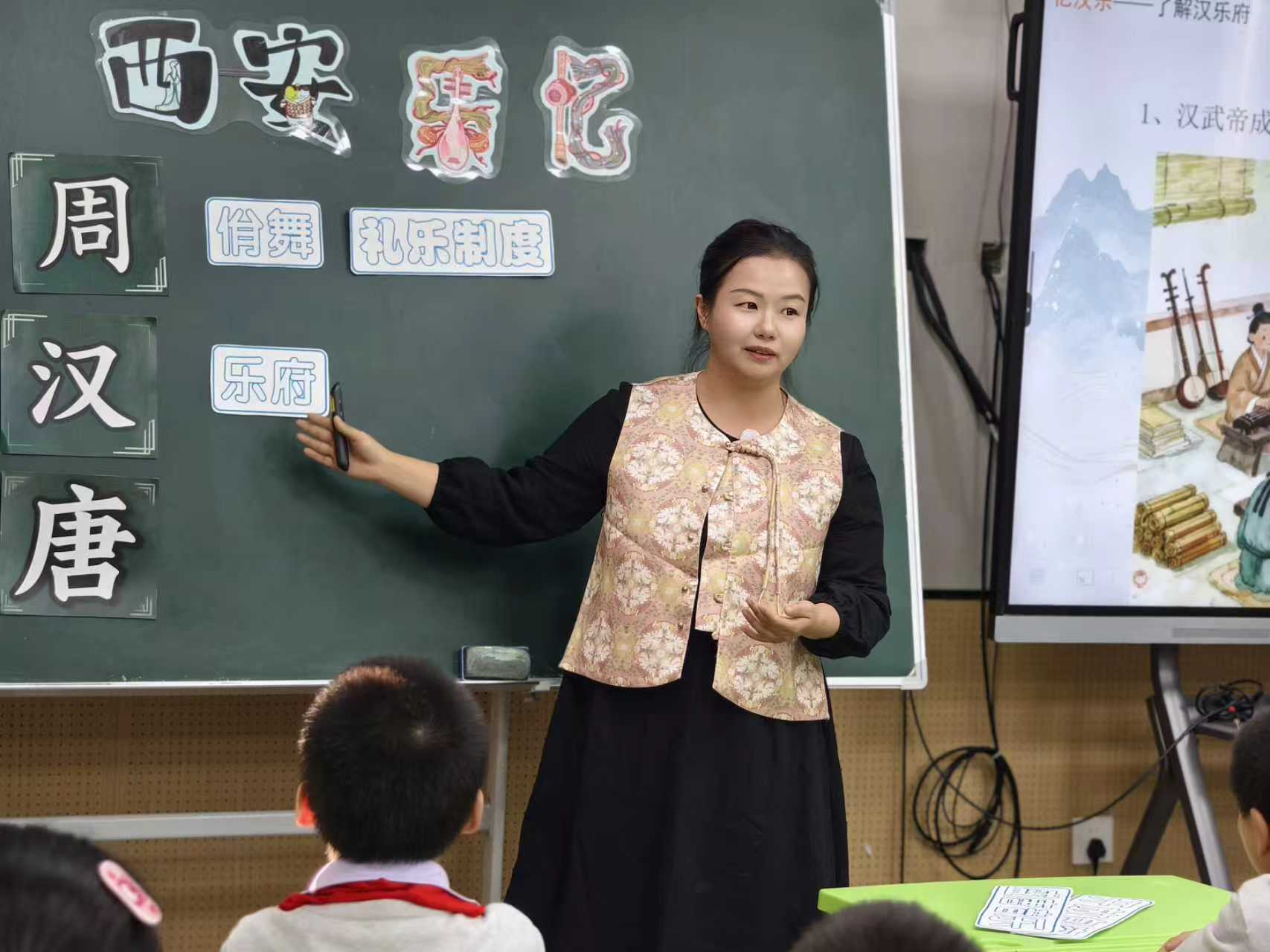 梅峰小学李航榕老师执教《西安乐忆》。她借助 AI 技术“数字复原”了周、汉、唐三代的礼乐宏大场景,将原本枯燥的“音乐考古”转化为沉浸式的“时空对话”,在古今交融的旋律中,让中华礼乐文化的自信种子在学生心中生根发芽。