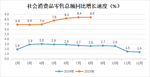 1-8月,全区社会消费品零售总额同比增长8.4%,与上月持平。其中,限额以上社会消费品零售总额同比增长12.5%,与上月持平。1-8月,从商品类别看,限额以上单位21类商品中16类商品零售额实现同比正增长。绿色消费渐成新风尚,新能源汽车、可穿戴智能设备、智能家电、节能家电消费快速增长,1-8月分别增长177.6%、113.0%、79.6%和44.2%。基本生活类商品仍是重要拉动力,限上粮油食品类零售额同比增长68.7%。线上零售保持高速增长,1-8月通过公共网络实现的商品零售增长65.3%。