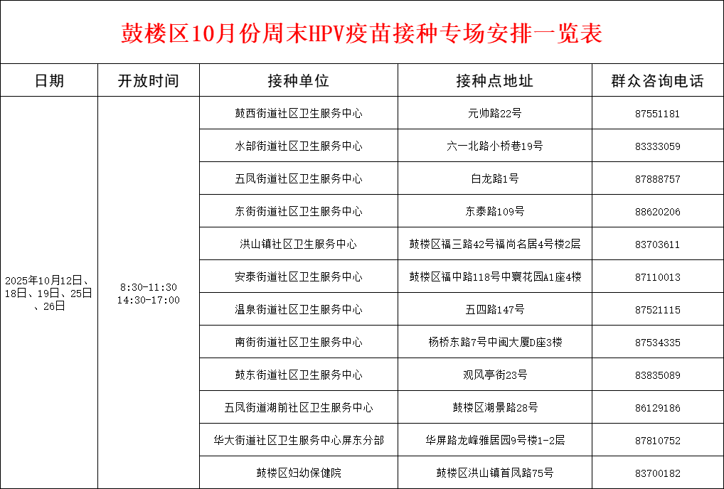 为更好地推进鼓楼区适龄女性HPV疫苗接种工作,方便在校学生接种。鼓楼区将于10月份的多个周末(10月12日、18日、19日、25日、26日)开放全天接种服务。具体时间安排详见下表: